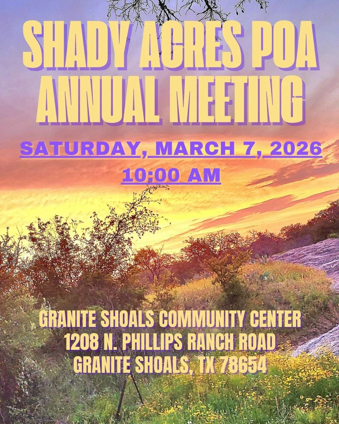Shady Acres Subdivision and Burnet County are frequently under a county wide “burn ban”. Before burning, please contact Burnet County to register a controlled burn on your property @ (512) 756-8080 to Burnet County Sheriff’s Office. In the event an EMERGENCY, you can also contact Granite Shoals Fire Department @ (830) 596-8130 or 911.